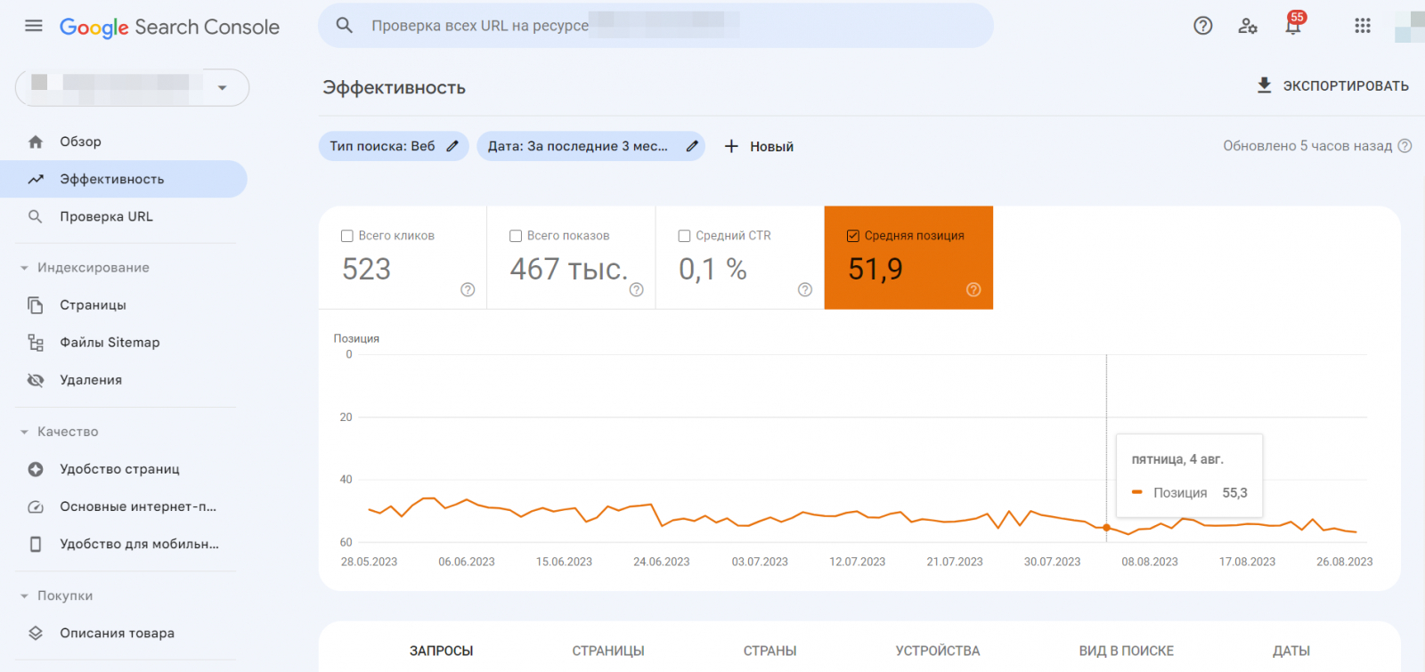 Также не забывайте про платформы от Google и Яндекс. Например, в Гугл в разделе «Эффективность» вы можете провести исследование средней позиции — как по всем фразам, так и по каждому ключевому запросу отдельно: