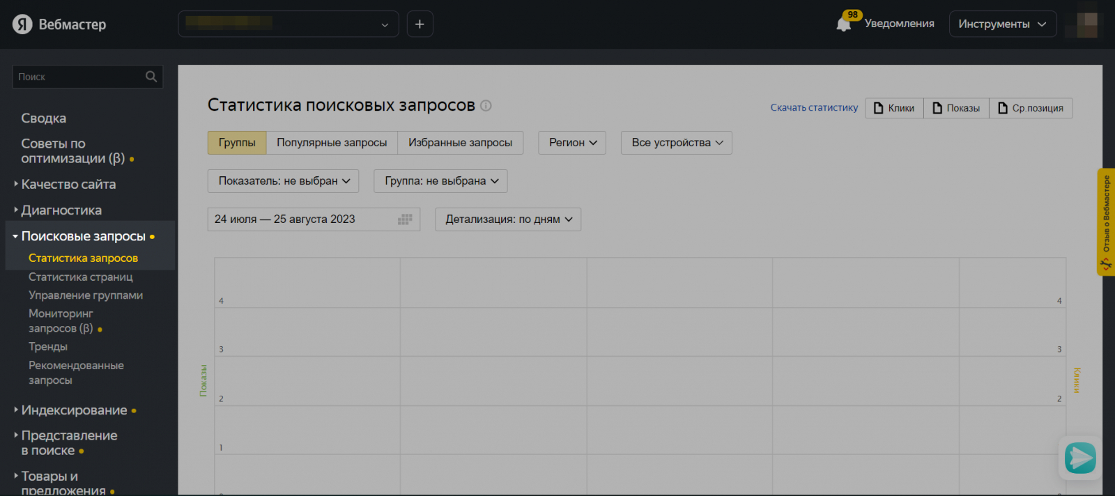 В Яндекс.Вебмастер в блоке «Поисковые запросы» — «Статистика запросов» можно изучить видимость по всем ключам или группам.