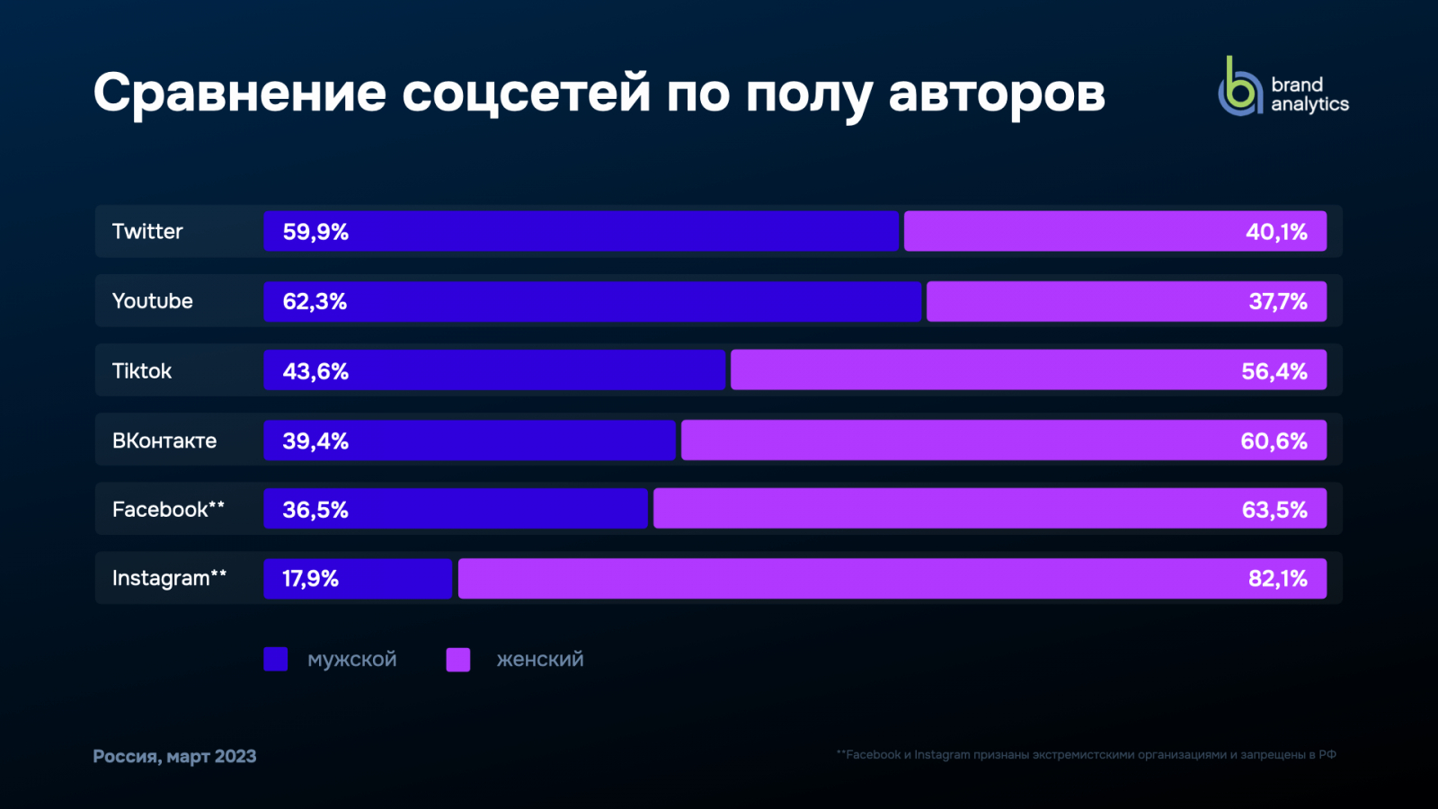 Отличия с точки зрения ЦА между площадками есть. В Instagram* и Facebook* аудитория всегда была преимущественно женской, до 80% от общего объёма пользователей. YouTube — исторически мужской, здесь больше 60% мужчин. Аудитория ВК — преимущественно женская, 60% (от 25-44 лет).