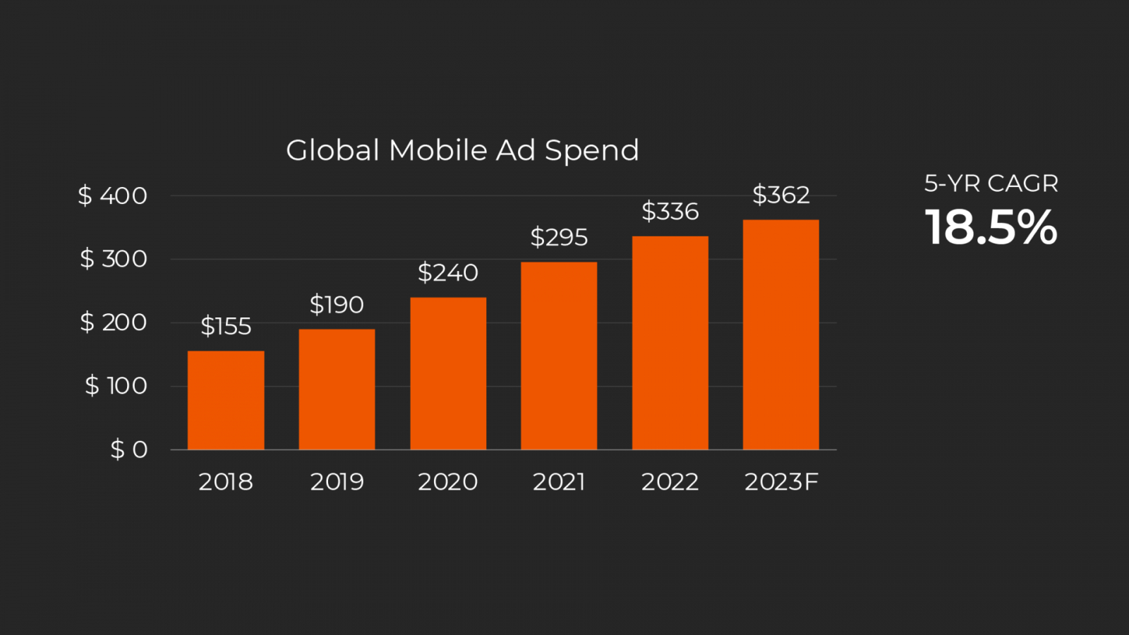 Согласно Data.ai, рекламные расходы на мобильный маркетинг стабильно растут от года к году. За 5 лет расходы на него увеличились на 217%. По прогнозам, эта тенденция сохранится и в следующие 5 лет.