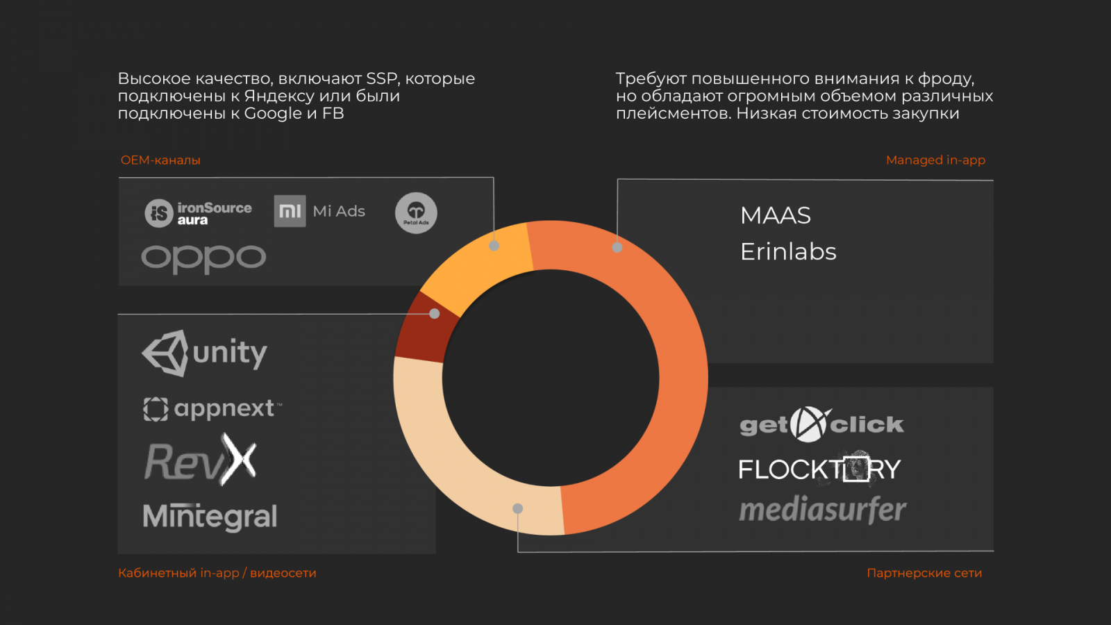 Многие клиенты привыкли к тому, что in-app –– это одна строчка в медиаплане. Однако in-app очень разный. Мы выделяем 4 категории поставщиков:
