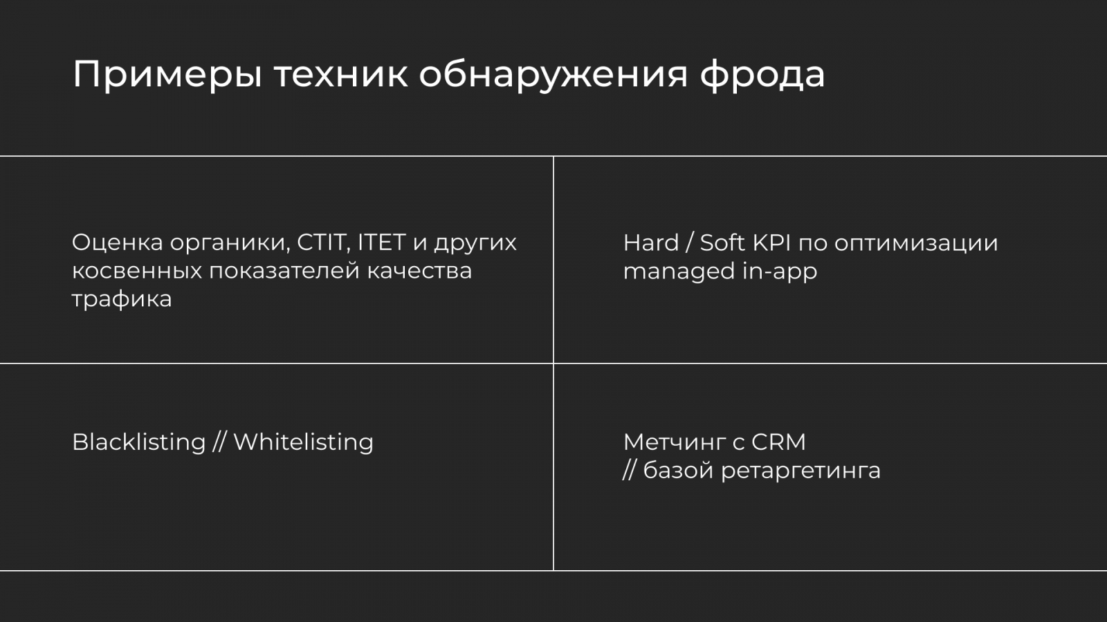 Наиболее важная особенность in-app трафика, которую мы намеренно упустили в блоке выше — базово низкое качество. Доля ботового трафика может доходить до 50%. Поэтому особую роль в закупке источника играет антифрод.