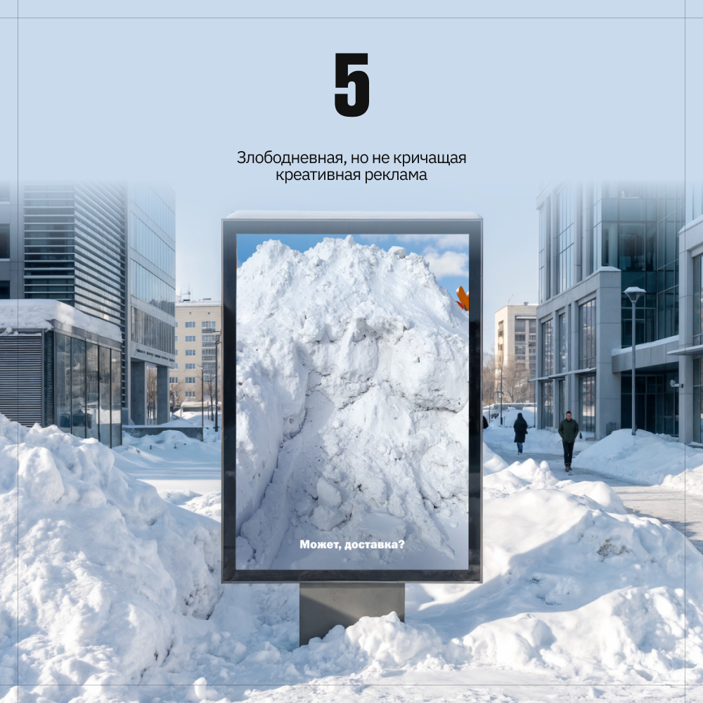 За счет того, что в наружной рекламе логотип практически не видно — появляется огромное желание отгадать, кто же из брендов спрятался за снегом. После получаешь удовольствие от того, что смог разгадать тайну, и видишь призыв к доставке, конечно)