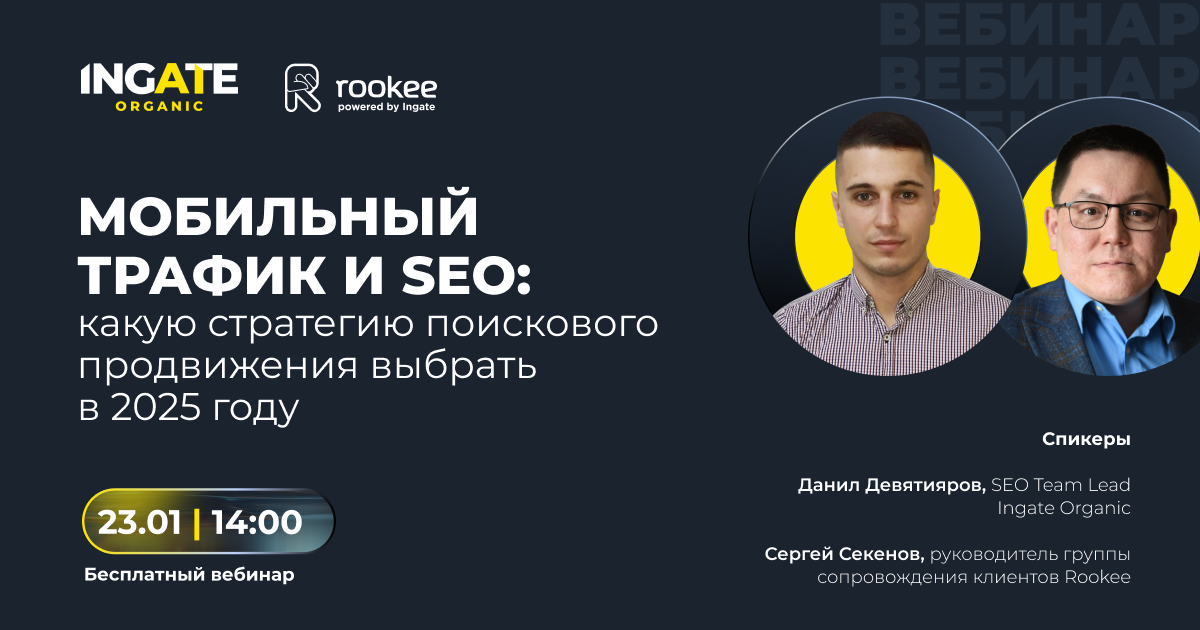 23 января в 14:00 встретимся с SEO-экспертами Ingate Group и Rookee, чтобы обсудить, на что обратить внимание при продвижении сайта в 2025 году, чтобы не потерять и приумножить мобильный трафик.