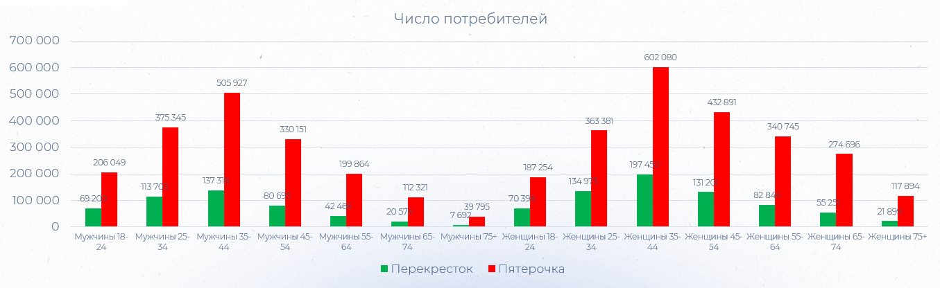 Мы выявили наиболее выраженные возрастные группы и менее охваченные категории, где есть потенциал для роста. Аналогично сделали с данными по X5, чтобы сравнить соотношение групп из двух разных источников.