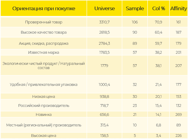 В ходе исследования определили основные драйверы покупок, которые влияют на принятие решения о покупке (с учетом дифференциации по уровню дохода потребителей). Дополнительно провели анализ товарной корзины целевой аудитории и определили товары, которые чаще всего покупают.