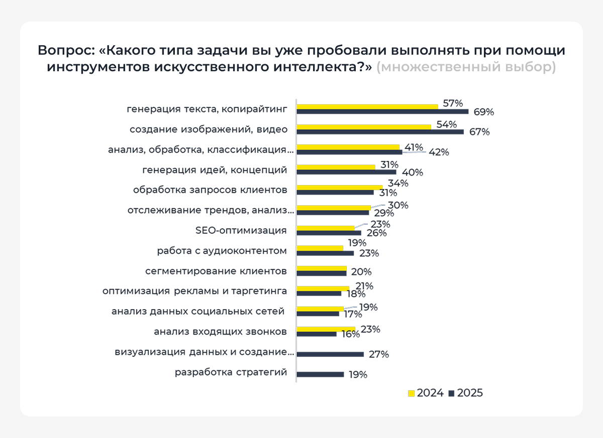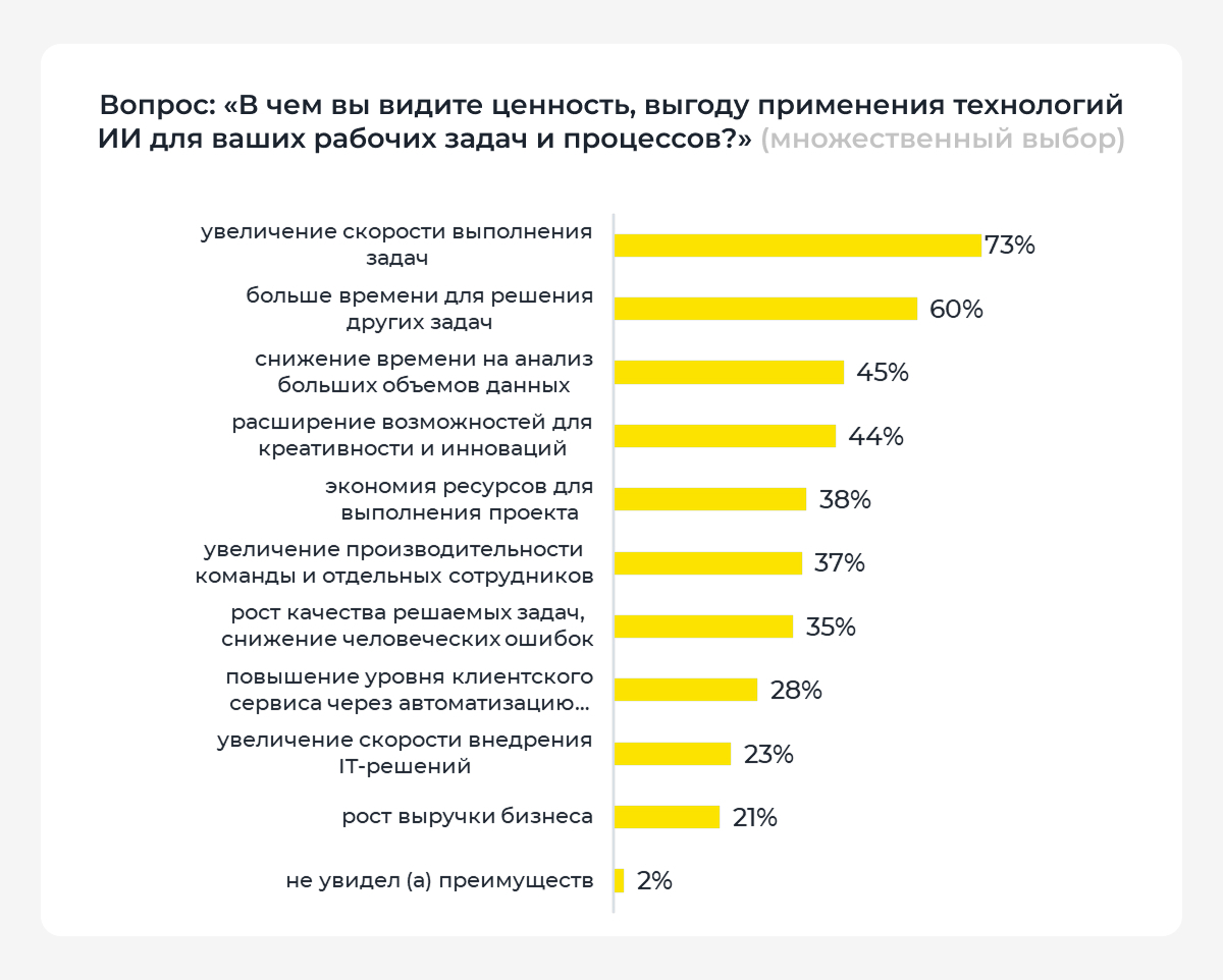 Основными барьерами применения ИИ в своей работе респонденты отмечают отсутствие глубоких знаний в составлении запросов к нейросетям (47%), недоверие к ИИ (42%) и риски, связанные с конфиденциальностью (35%). При этом показатель “дефицит профильных специалистов” за год снизился почти в 1,5 раза (38% в 2025 году против 50% в 2024).