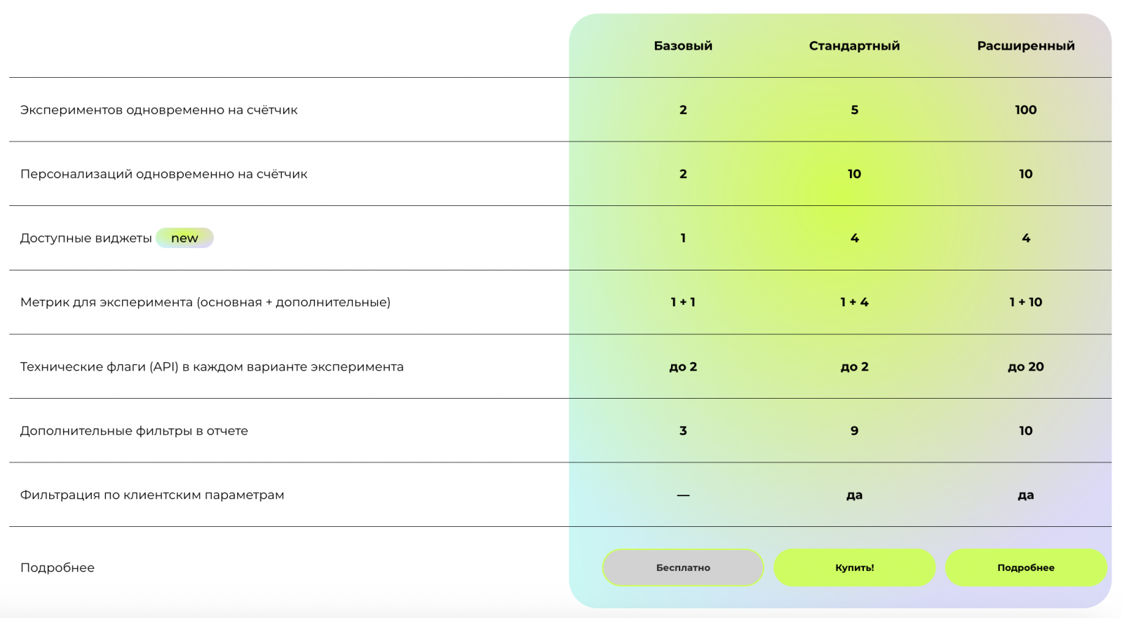 Базовый бесплатный тариф имеет ограниченный функционал, но даже его хватит, чтобы провести качественный A/B-эксперимент.
