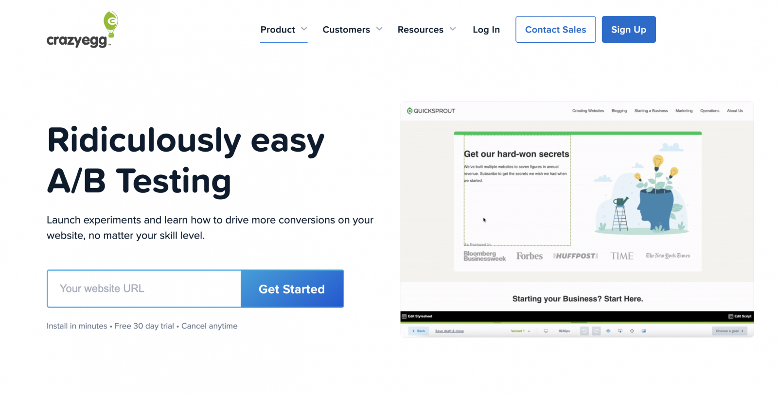 Crazyegg обещают «до абсурдного легкое проведение A/B-тестов» для того, чтобы сайт начал приносить больше конверсий.