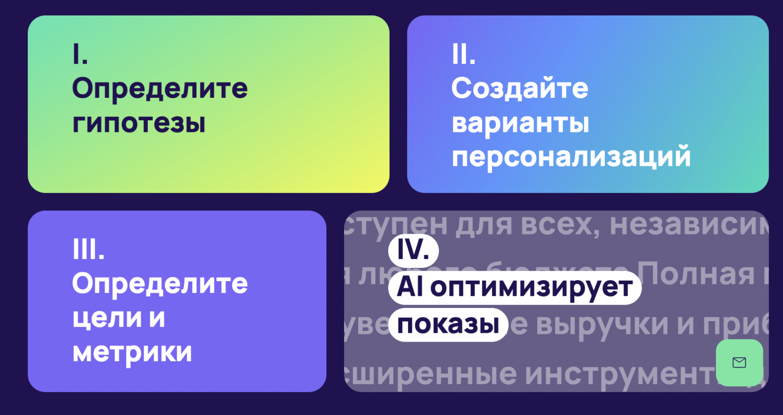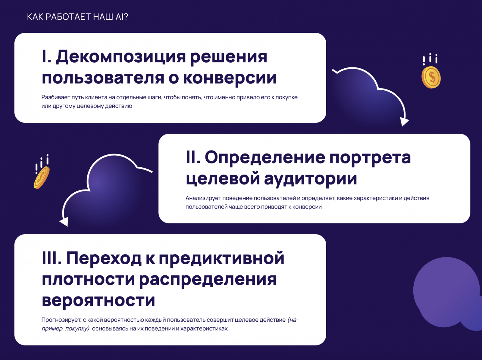 ИИ разбивает решение о совершении конверсии пользователем на этапы, определяет портрет целевой аудитории и прогнозирует, с какой вероятностью пользователь совершит целевое действие: