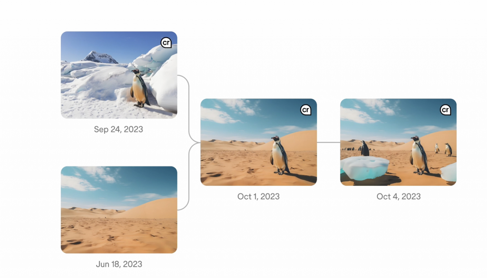 Кроме того, в 2023 году возникла инициатива Content Credentials. Ее цель — возможность четко понимать, какой на самом деле источник информации. Озабоченность вопросом выросла из-за стремительного роста дипфейков, клонирования голосов и других форм искажения реальности. Вы можете не только изучить и установить наличие скрытых водяных знаков, но и проследить путь трансформации изображения, а возможно даже нескольких. Например, когда два разных изображения стали источником третьего.