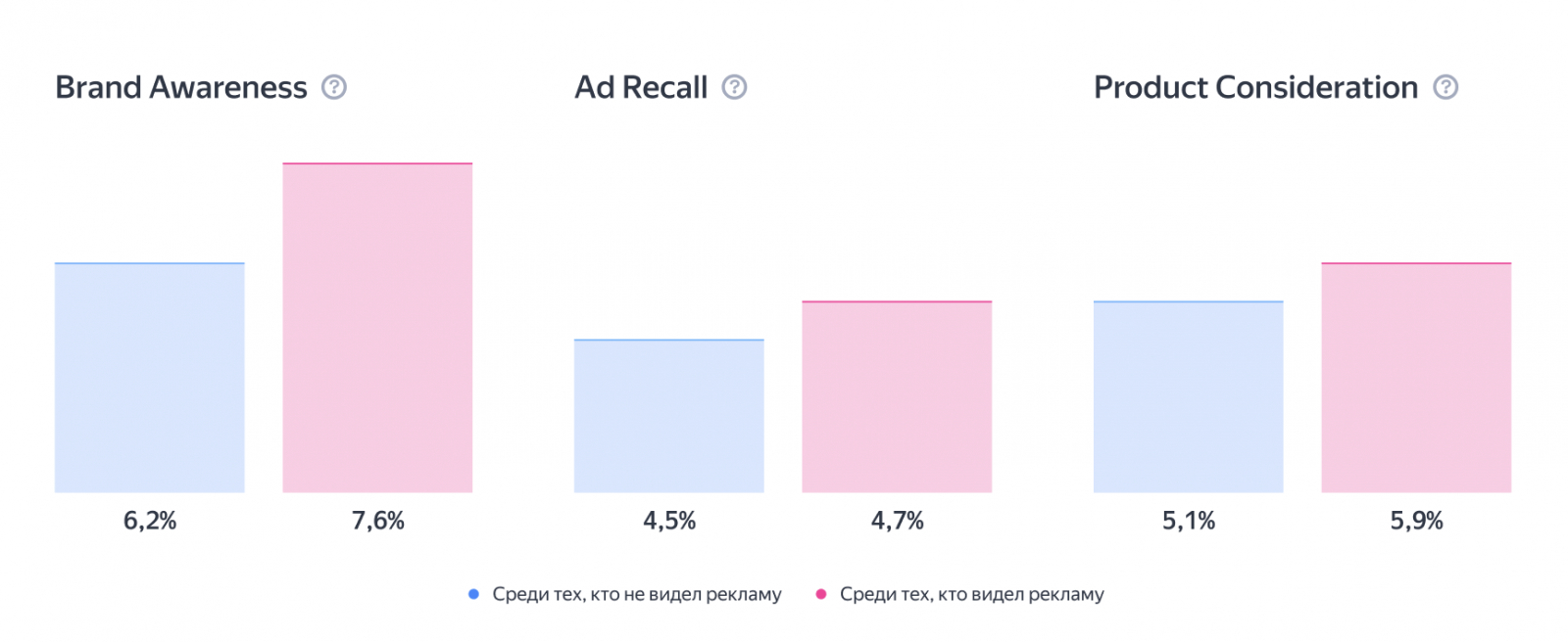 Отслеживайте, как ваше медийное продвижение влияет на восприятие бренда. При запуске медийной рекламы из Яндекс Директа исследование функционирует следующим образом: опрашивается реальная аудитория рекламной кампании на предмет узнаваемости бренда (BrandAwareness), запоминаемости рекламы (Ad Recall) и намерения совершить покупку (Purchase Intent), рассмотрения продукта для покупки (Product Consideration) и других аспектов.
