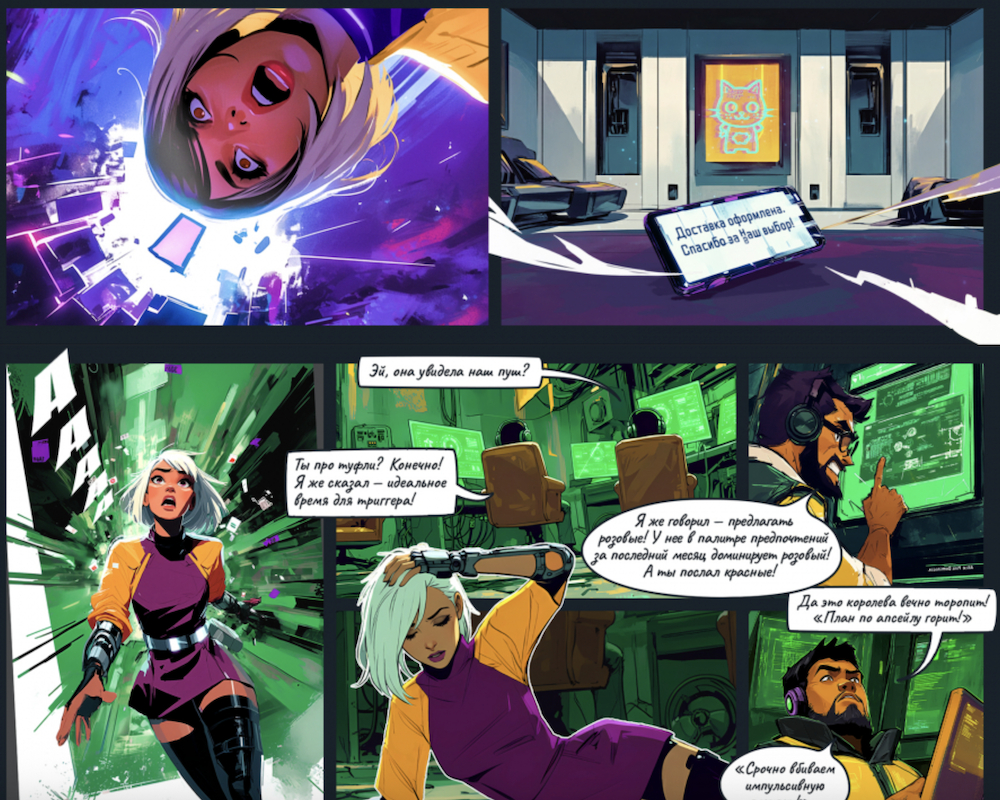 Отдельно хочется отметить, что, несмотря на впечатляющий результат, которого мы смогли добиться, на создание комикса ушло много времени и усилий. Нейросети пока не готовы быстро выполнять такие сложные задачи. От пользователя требуется высокий уровень владения составлением промптов, а также детальная проработка ТЗ. Например, негативные промпты, детализация, умение трансформировать сценарий в визуальную историю и др.