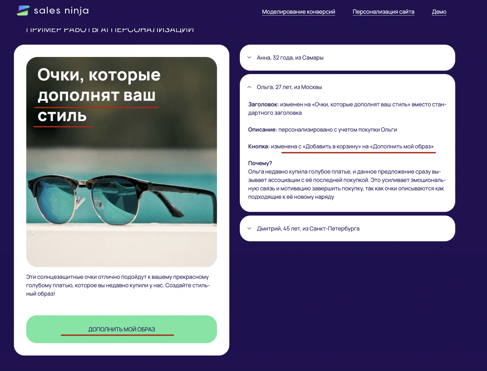 - Предиктивные AI-алгоритмы для персонализации сайта: когда мы говорим о сайте, речь уже идет не об олдскульных SEO-улучшениях, а о применении современных подходов к пользовательскому опыту. Инструменты на основе ИИ, например, Sales Ninja , дают нам возможность персонализировать сайт с учетом особенностей поведения пользователей и их предпочтений. Как? С помощью ИИ-алгоритмов сервис моделирует конверсии и оптимизирует по ним креативы.