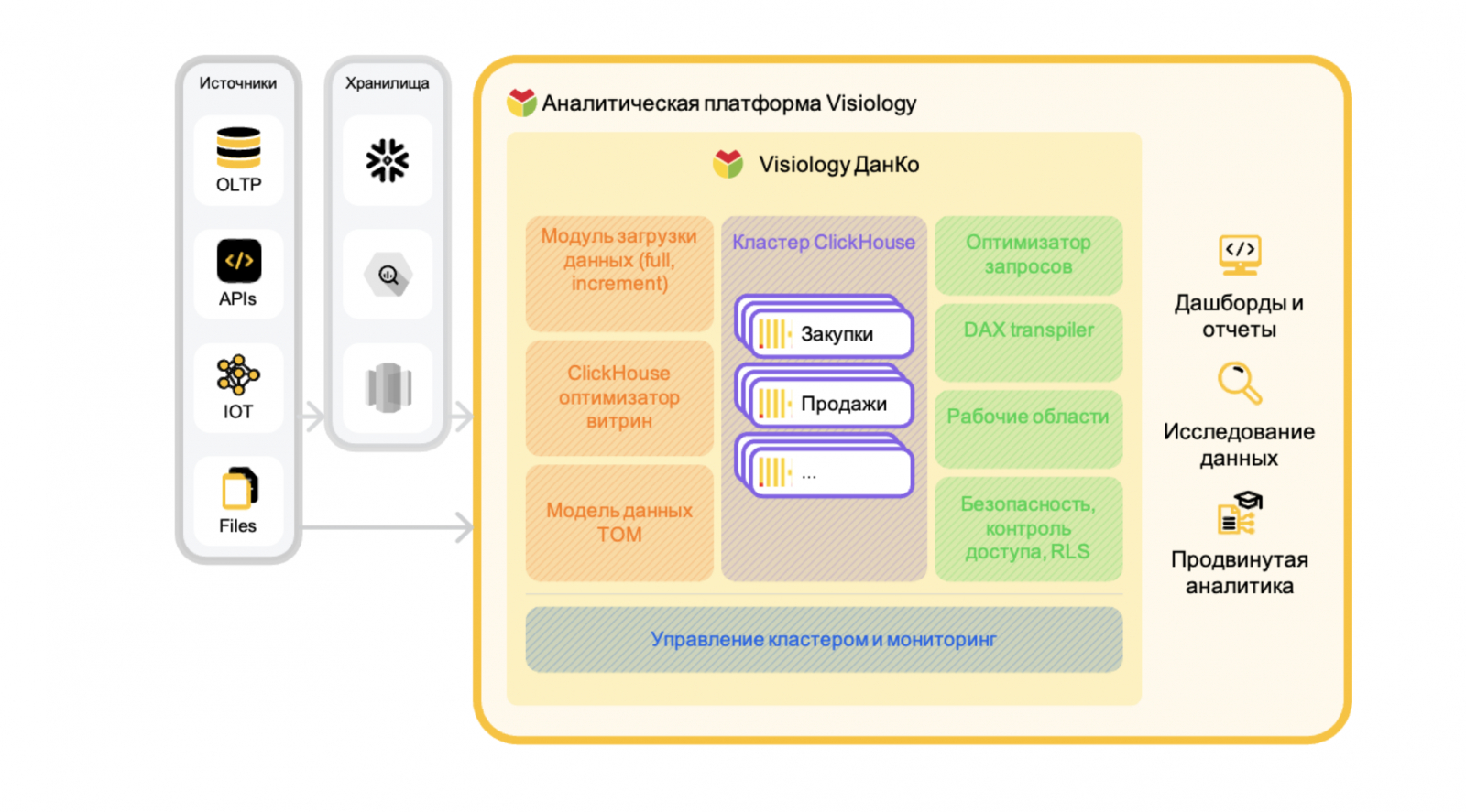 Аналитический движок «ДанКо» автоматизирует процессы, обеспечивая разделение доступа, быструю и эффективную обработку данных, постоянную загрузку из источников и доступность аналитики в различных форматах.