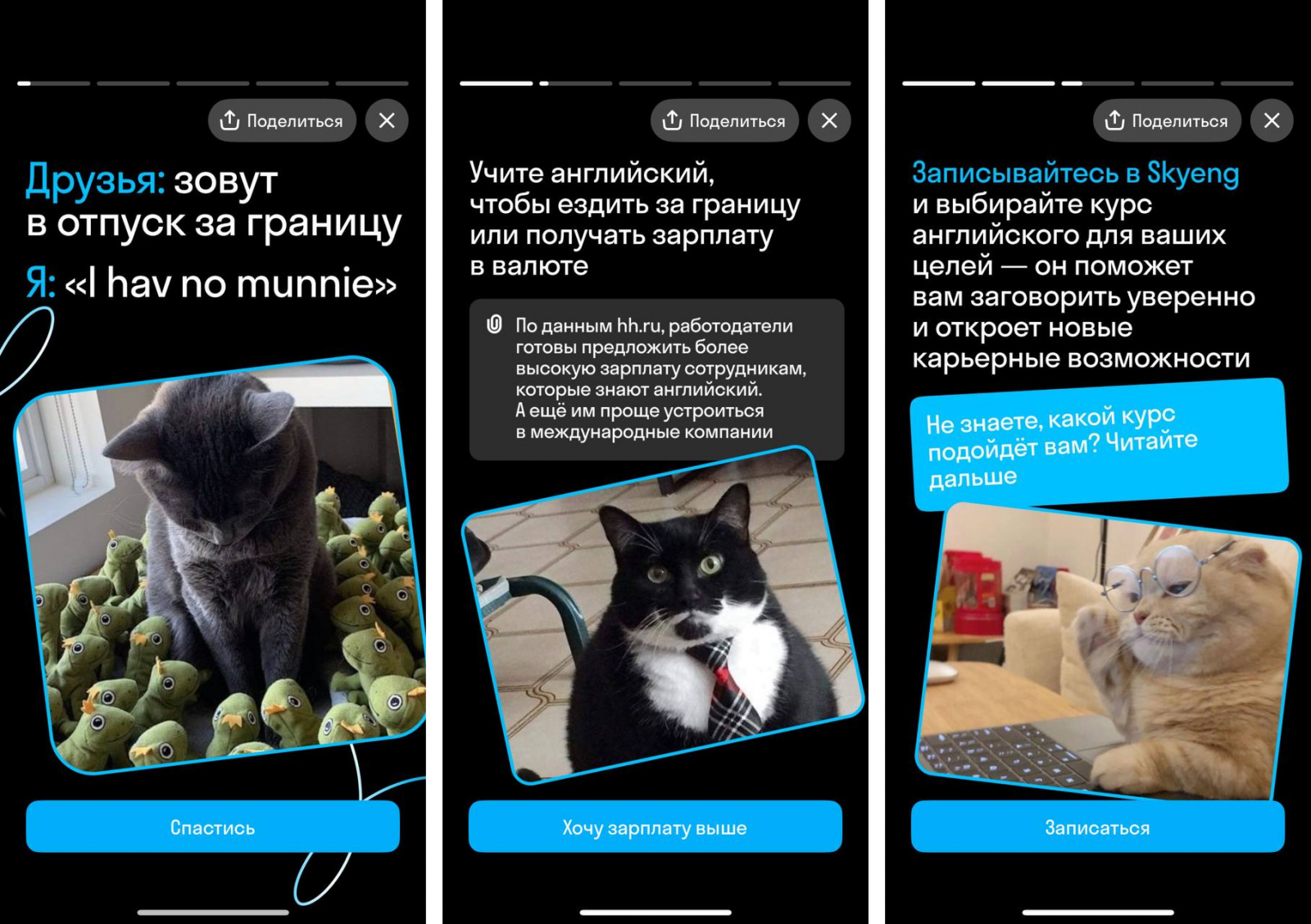 Иногда получается обнаружить совсем неожиданные инсайты, которые не укладываются в какую-то аналитику. Например, мы проводили A/B-тесты и выяснили, что сториз с котиками в приложении просто невероятно хорошо заходят: и с точки зрения кликабельности, и с точки зрения продвижения пользователей дальше по воронке. После сториз с котиками мы получаем больше заявок и оплат.