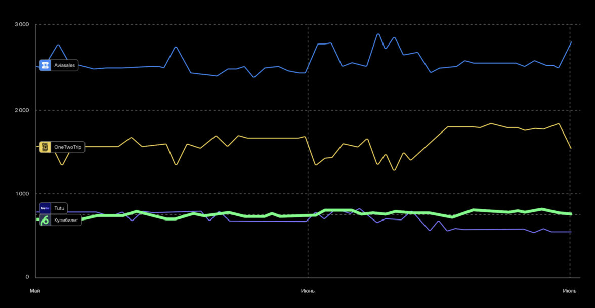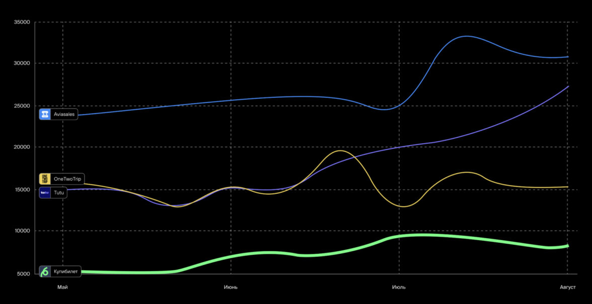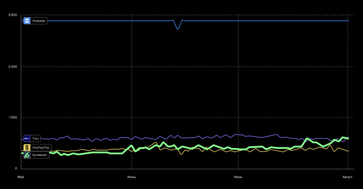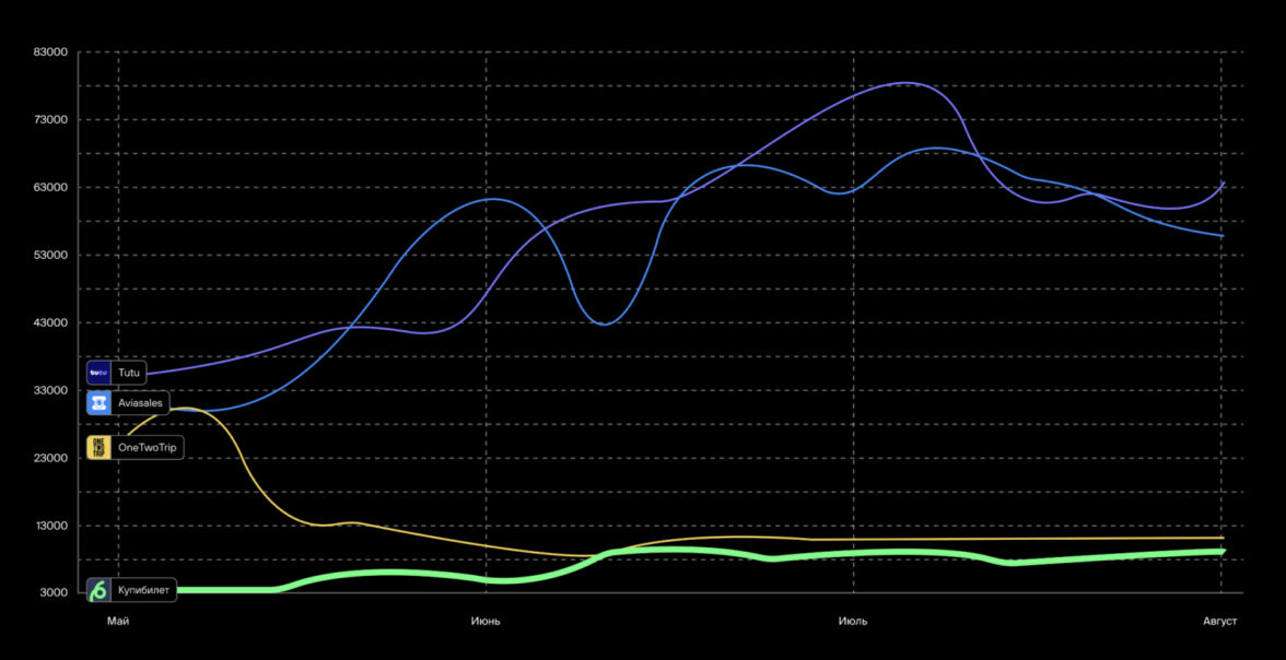 Для разработки действенной стратегии мы совместно с командой продукта провели комплексное исследование. Проанализировали динамику спроса в нише, оценили видимость и количество установок у приложений конкурентов и сравнили их с показателями «Купибилета».