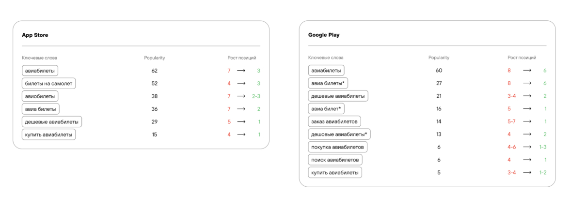 В конце июля заметили просадку по одному из самых частотных запросов — «Купить авиабилеты». Чтобы стабилизировать ситуацию, усилили кампанию: за короткий срок привлекли 300 мотивированных установок. Это дало нужный импульс — приложение вышло на первое место по этому запросу.