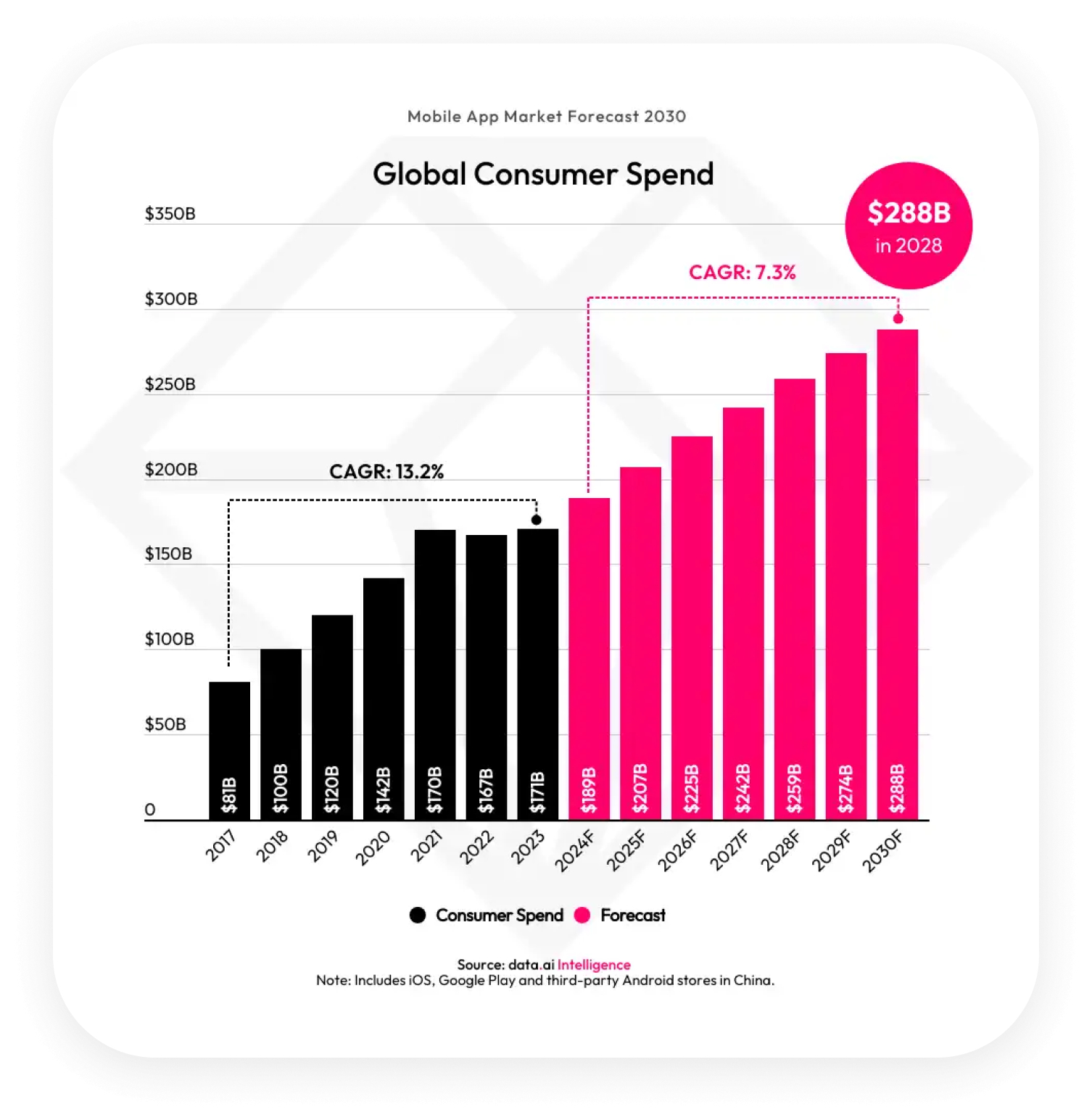 Аналитики ожидают, что среднегодовой прирост трат пользователей на мобильные приложения до 2030 года будет составлять 7,3%. Звучит довольно оптимистично — в период с 2021 до 2023 видим явное замедление.