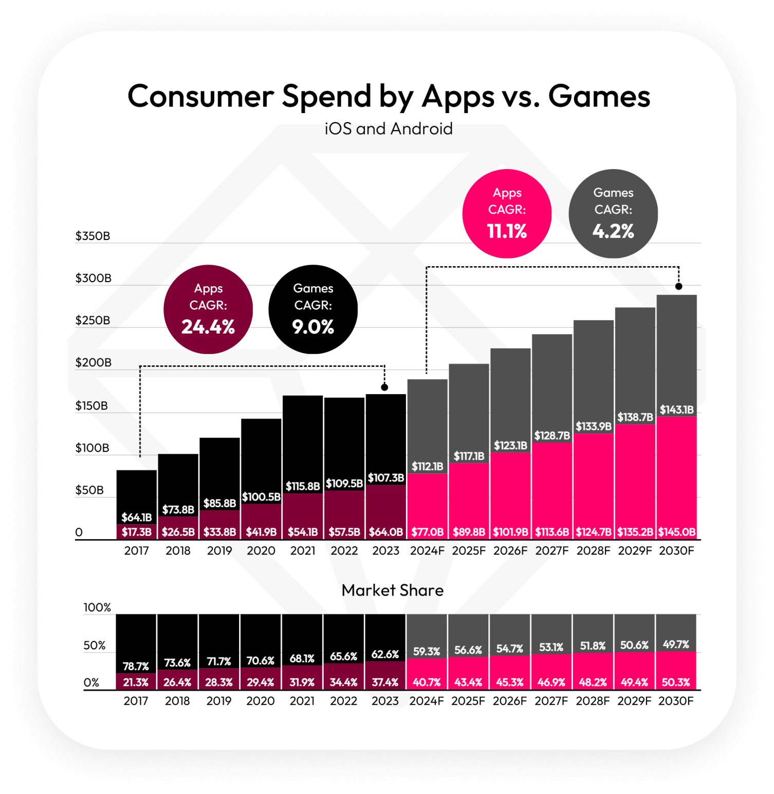 Темп роста доходов должен замедлиться: для игр с 24,4% до 11,1%, для приложений с 9% до 4,2%. Расходы пользователей на игры и приложения сравняются только в 2030 году.