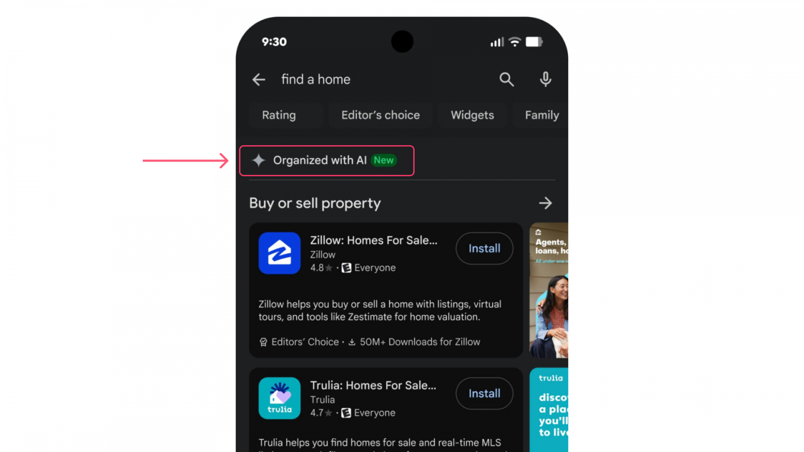 Google стремится сделать поиск в сторе более простым и интуитивным. С новой функцией Guided Search пользователю не нужно вводить точное название приложения — достаточно описать цель, например: «найти жилье». ИИ анализирует запрос и группирует результаты по категориям: покупка и продажа недвижимости, бронирование апартаментов и так далее.