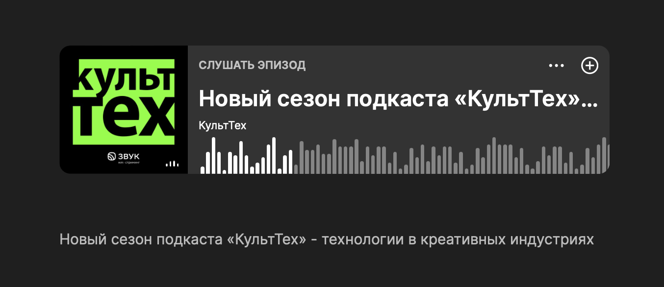 Два первых сезона подкаста «КультТех» вышли в Звуке в прошлом году. В первом сезоне обсуждался театр и все с ним связанное, во втором — арт, визуальные искусства и воздействие на них технотрендов. Затрагивались темы метавселенных и NFT, взаимодействия с этими новейшими технологиями более традиционных институтов (театров, музеев). Обсуждались создание и развитие контентных вселенных, рассматривались даже фантазии о будущем искусства, которые стали реальностью. И, конечно, была поднята тема нарастающего влияния на культуру ИИ.