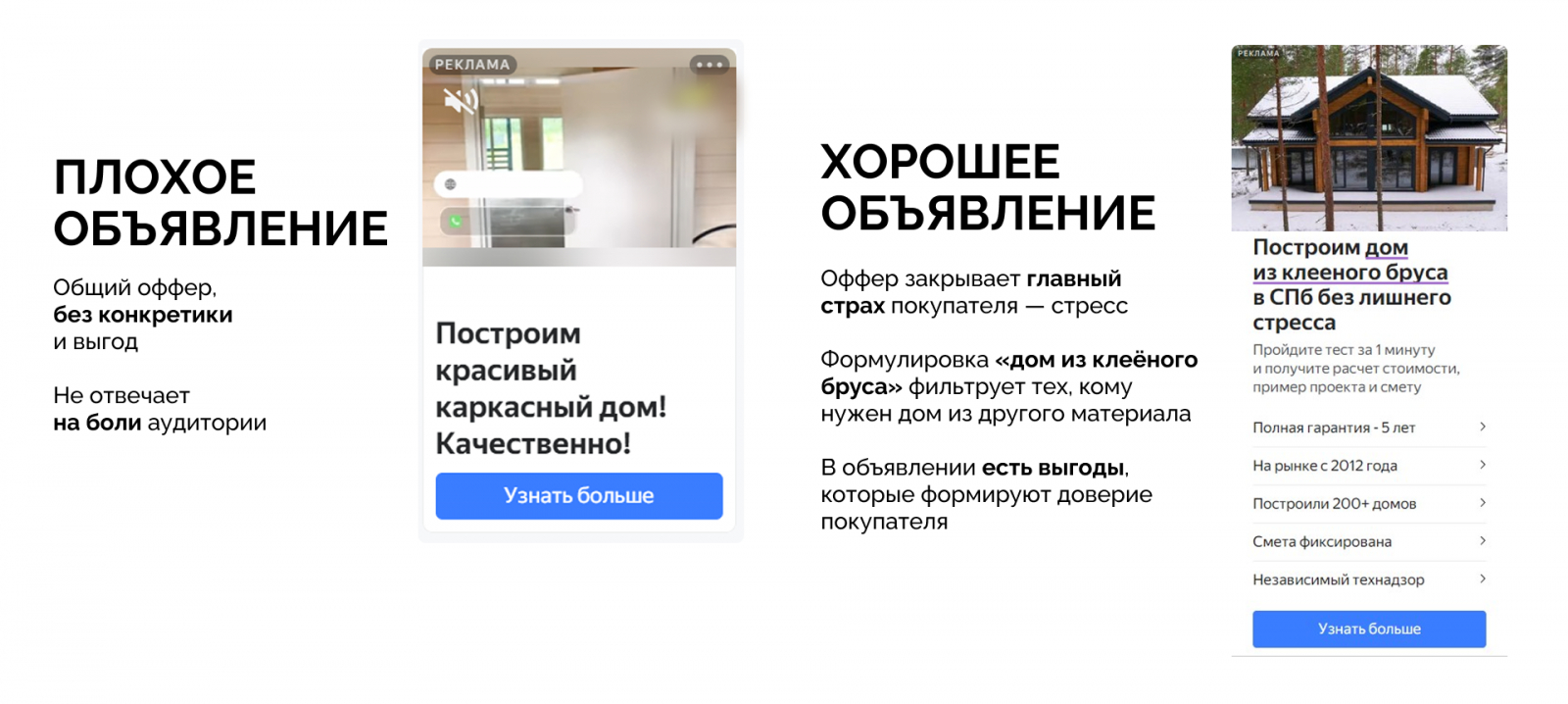 Такой оффер работает лучше, потому что показывает конкретное действие и обещает результат. Система обучается на целевых кликах, и реклама приводит более качественных лидов.