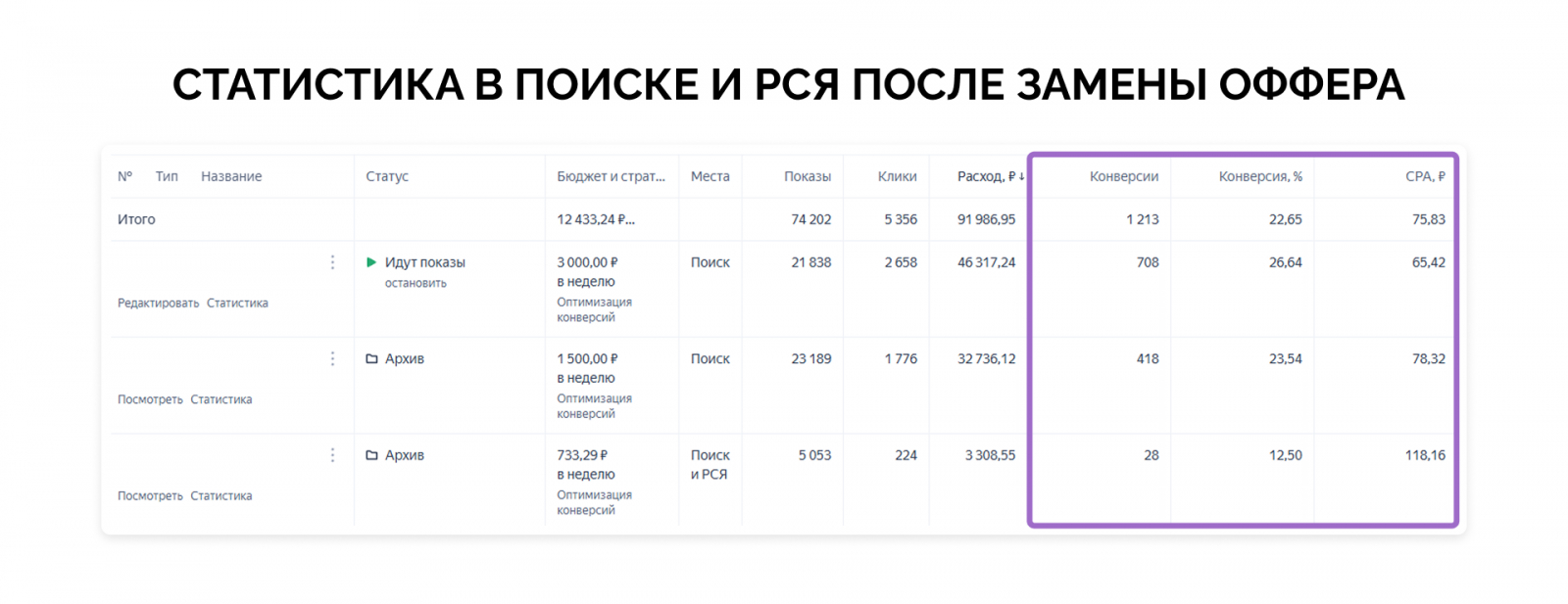 После замены оффера результаты заметно улучшились. Новый вариант оказался точным и понятным — он сразу отвечал на запрос аудитории и подчёркивал выгоду.