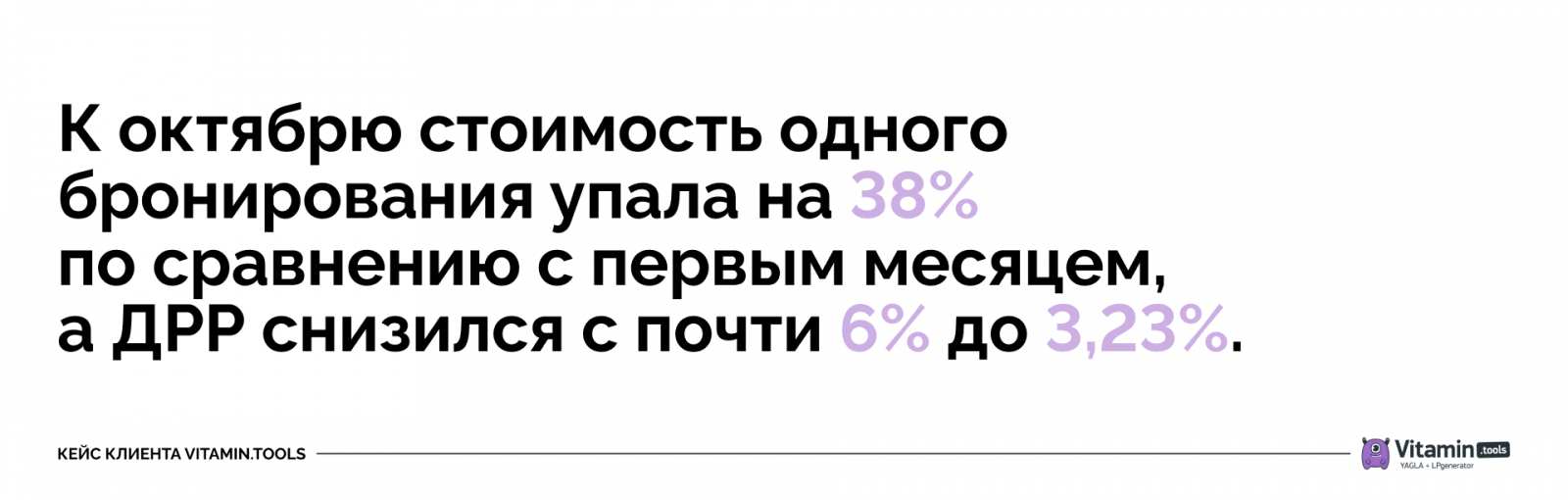 Результат — снижение стоимости брони на 38% и ДРР на 43% за три месяца работы в период спада сезонности.