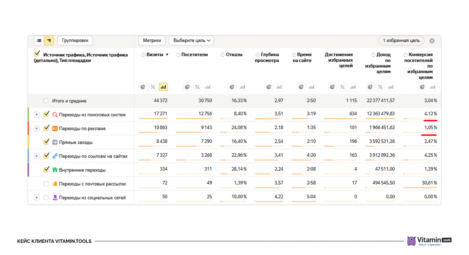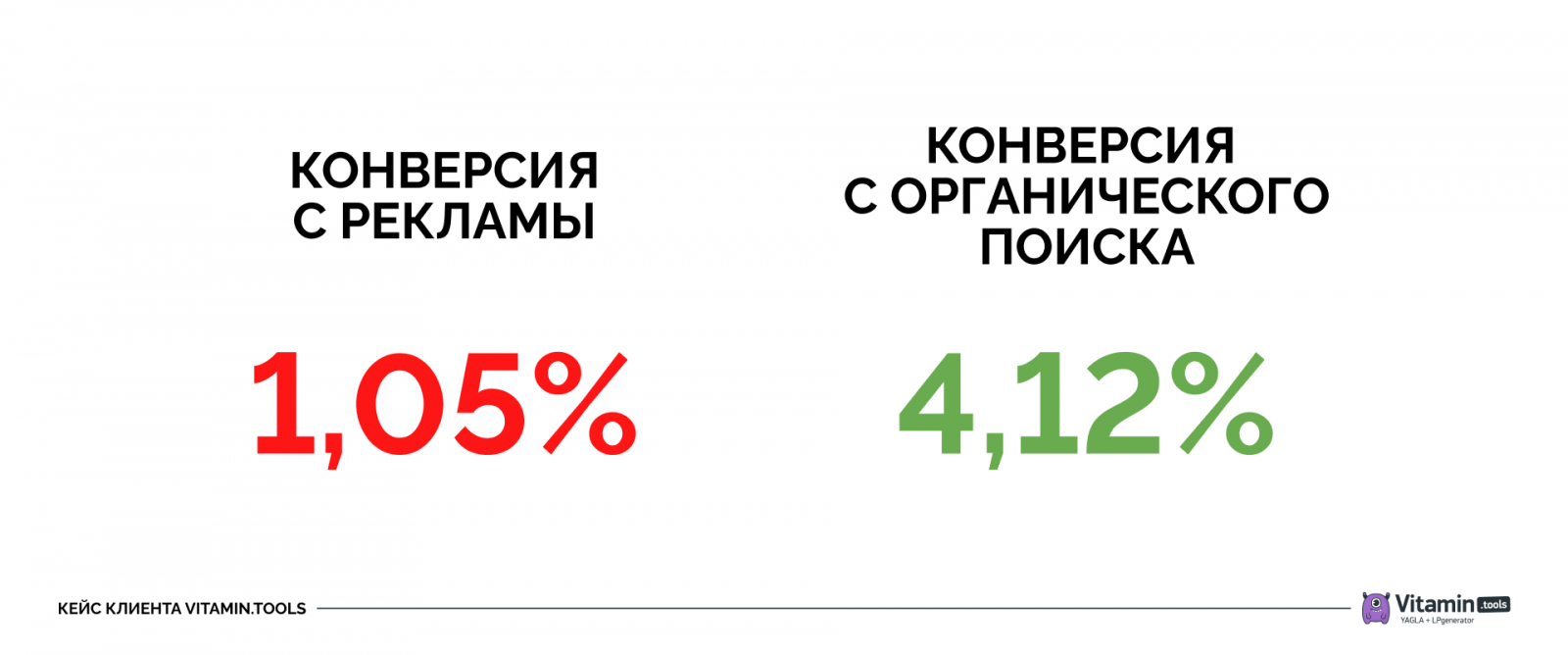 Но вот что интересно: конверсия по брендовым запросам составляла 5,88%, что в полтора раза выше органики.