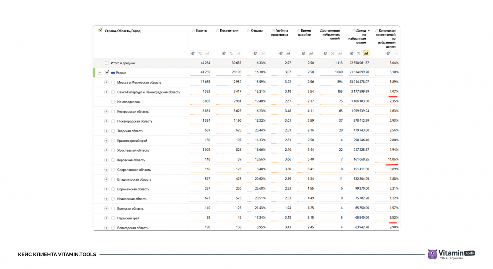 Шаг 2. Расширяем географию. Запускаем отдельные группы объявлений на Рязанскую, Нижегородскую, Ярославскую, Тверскую, Ивановскую, Владимирскую, Кировскую и Свердловскую области. Там клик стоил дешевле, а конверсия обещала быть выше. Проект заводили через Vitamin.tools — рекламную экосистему, возвращающую до 18% от пополнения рекламы.