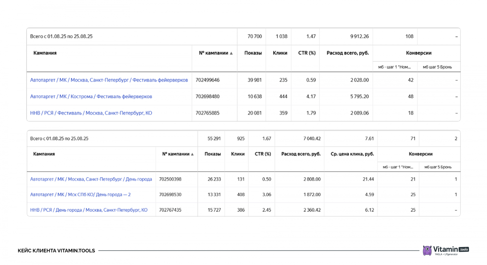 Торговая кампания стала абсолютным лидером — 56 бронирований по 930 рублей каждое. Мастер-кампания по конкурентам принесла 8 броней по 1 437 рублей. Отдельные креативы давали по 6-8 броней.