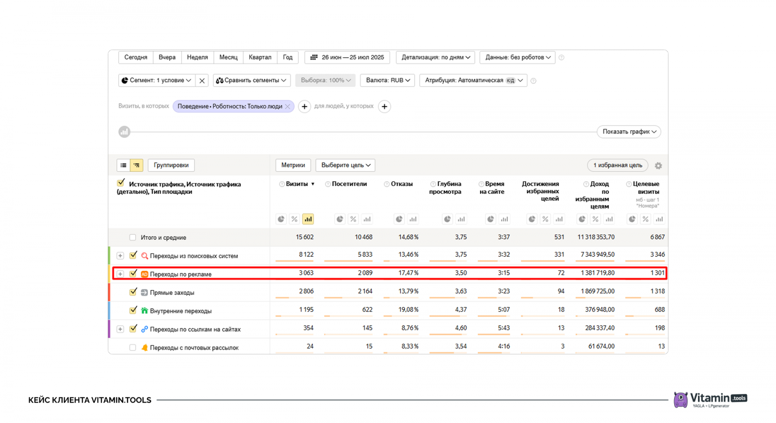 Мы перераспределили бюджет в пользу самых эффективных связок, отключили неработающие креативы, усилили ставки там, где конверсия была особенно высокой. В результате: