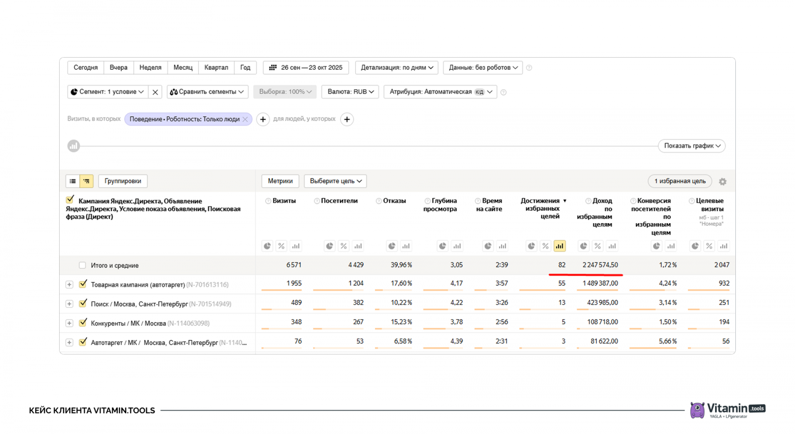 Яндекс не обучался, потому что трафик был размыт между 15 кампаниями, каждая из которых работала на бюджете в 3–5 тысяч ₽. При этом, потенциал был — брендовые кампании давали 5,88% конверсии — что в 1,5 раза выше органики.