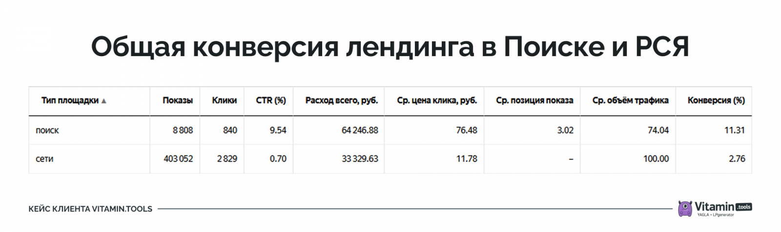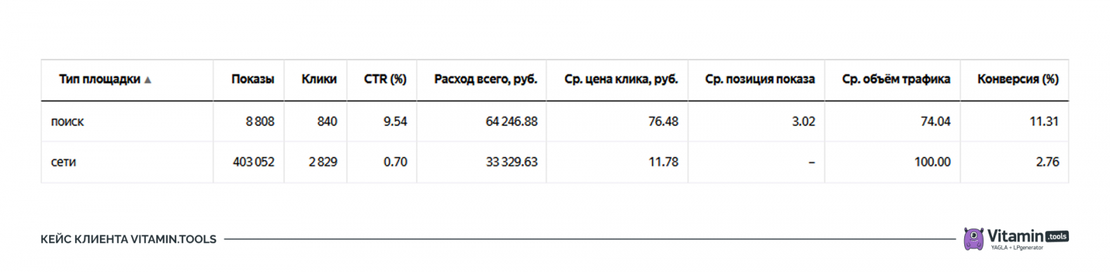 Стратегия оправдала себя: конверсия в РСЯ составила 2,76%, что является хорошим показателем для Яндекс Директа в этой тематике.