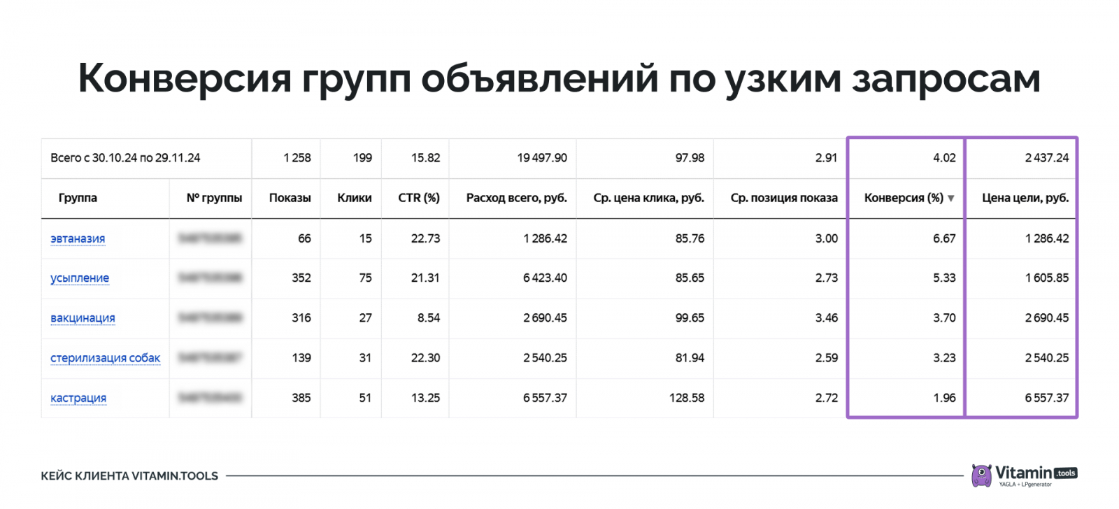 В итоге кампании с узкими запросами отключили для доработки контента.