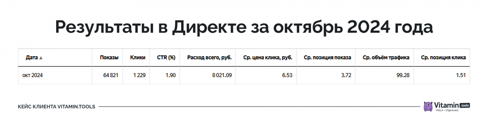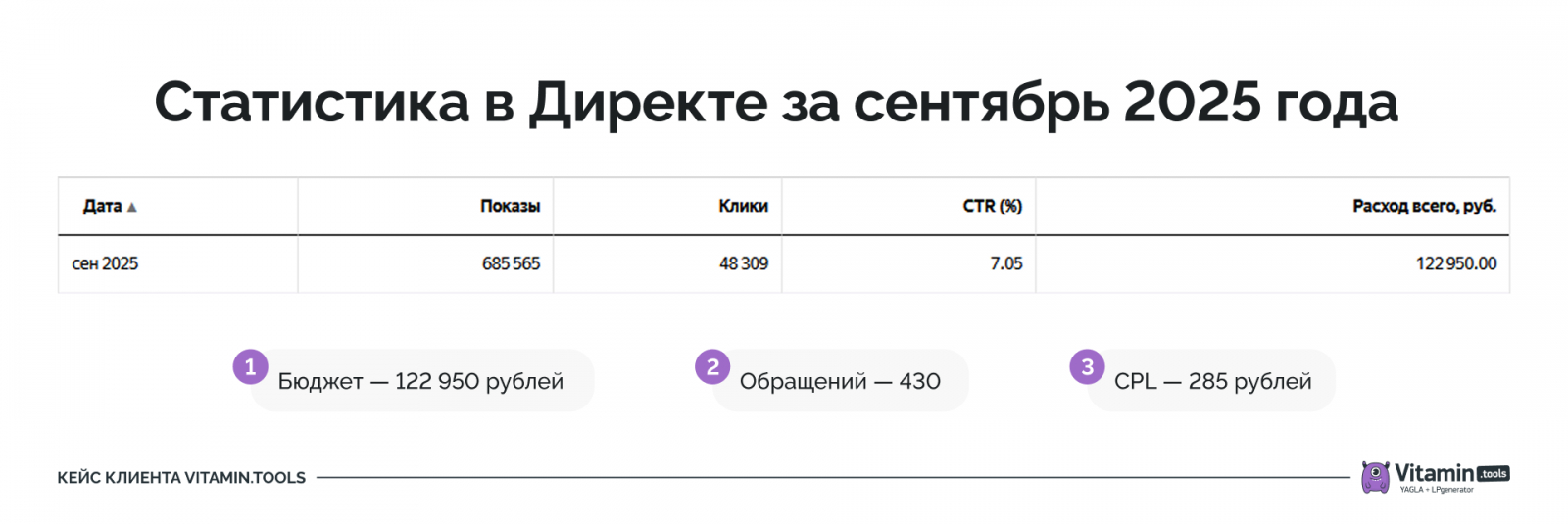 Когда работа над лендингом завершилась, наступил этап запуска трафика. Бюджет в 120 000 ₽ — сумма для небольшой клиники серьезная, и нам как агентству важно было распорядиться ею максимально эффективно. Мы решили завести проект в Vitamin.tools — рекламную экосистему, возвращающую до 18% от пополнения рекламы — и вот что это дало: