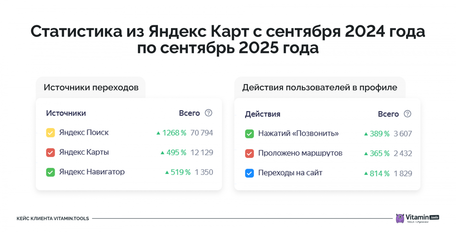 Первые три месяца оформляли и дополняли карточки клиники в Яндекс Картах, 2ГИС, Zoon и Flamp. Это заняло время, но дало стабильный органический трафик.