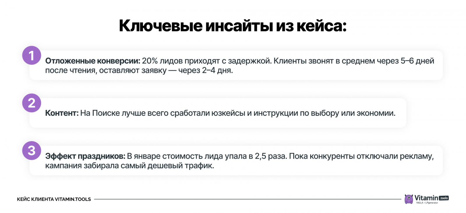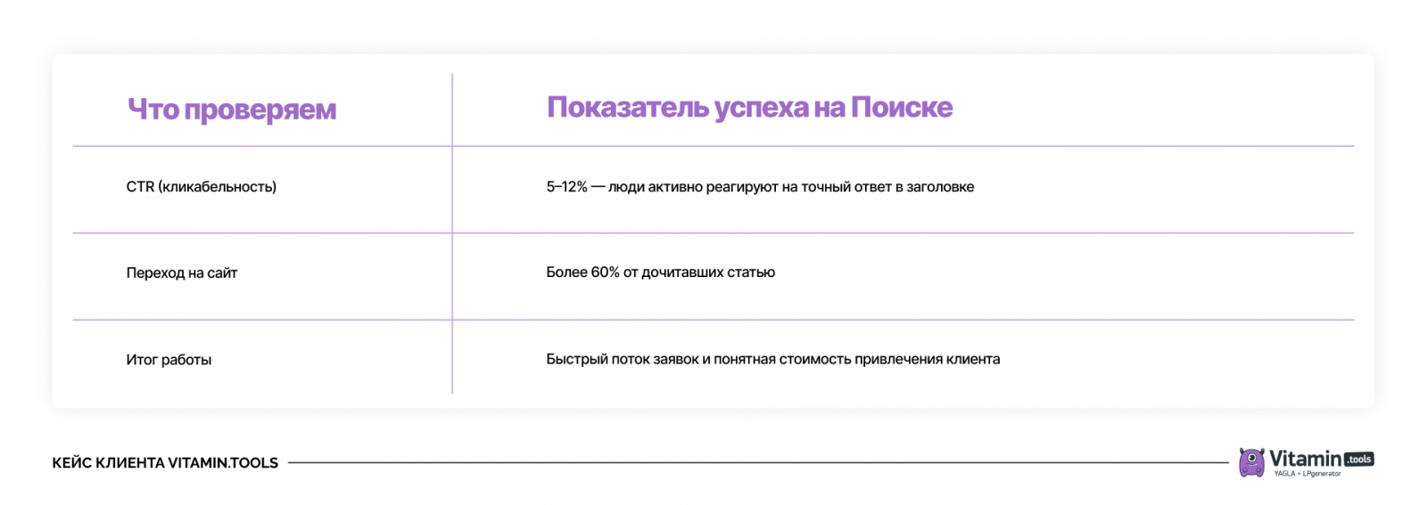 Команда перезапустила статьи, которые раньше давали хорошие охваты, но дорогие заявки. В поиске они начали приносить более стабильный результат. Дополнительно сработали материалы формата «как выбрать» и «как сэкономить». Даже юзкейсы показали эффективность в поисковой среде.
