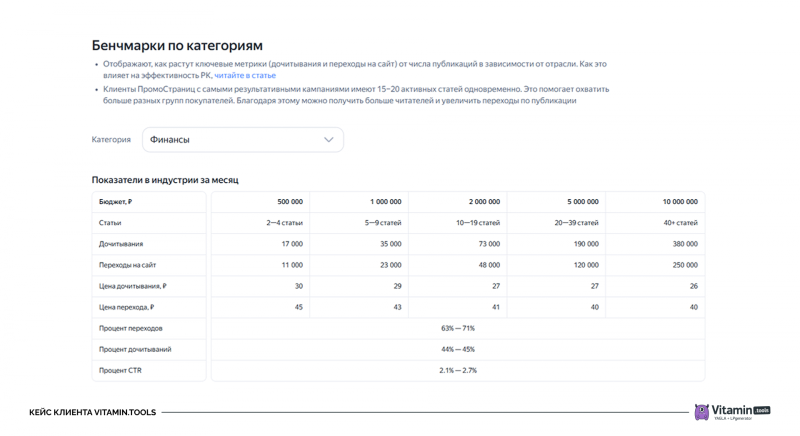 Показатели вовлеченности в РСЯ зависят от тематики и бюджета. Например, в категории Финансы средний CTR составляет 2,1%–2,7%, а процент дочитываний держится на уровне 44%–45%. Посмотреть эти цифры можно в рекламном кабинете.