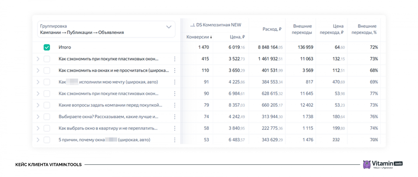 Работали через рекламную экосистему Vitamin.tools. Все кабинеты находились в одном интерфейсе, и мы не отвлекались на технические вопросы с оплатой и документами. Это позволило сосредоточиться на перераспределении бюджета внутри Яндекса и работе со стратегией.