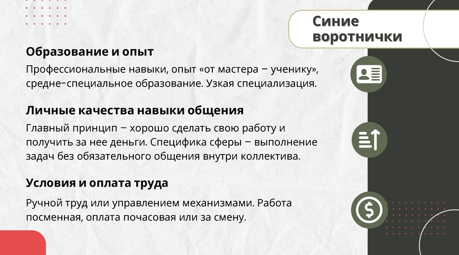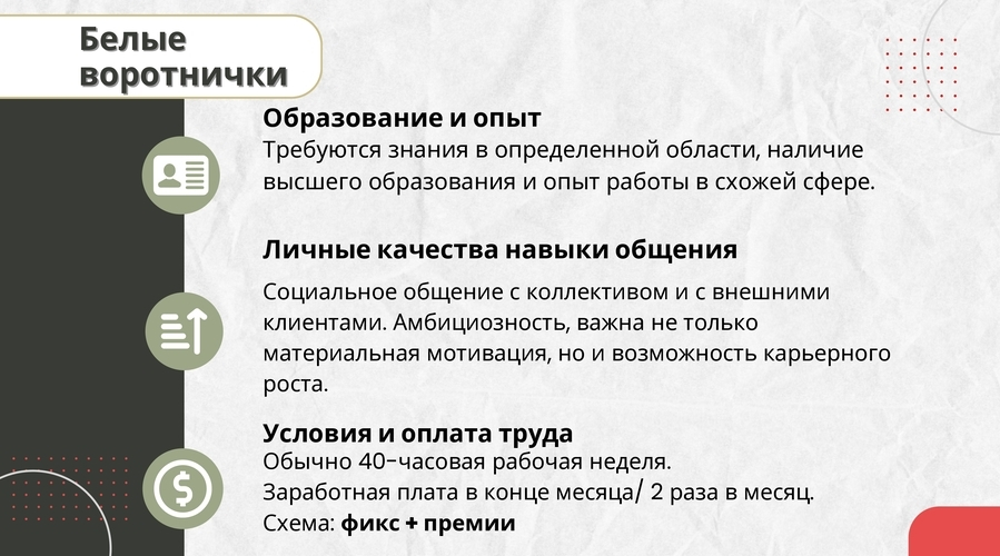 «Белыми воротничками» называют в основном офисных работников в сфере управления, консультирования, административной и технической поддержки: официальных лиц компаний, менеджеров, банковских работников, юристов, бухгалтеров и всех тех, чья профессиональная деятельность так или иначе связана с умственным, а не физическим трудом.
