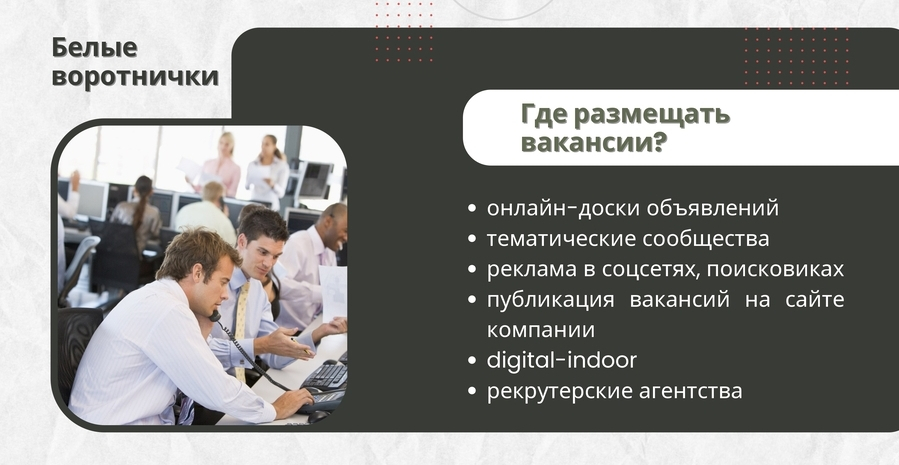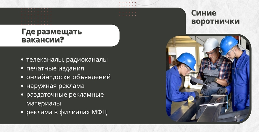«Синие воротнички» обычно оценивают конкретные задачи и умения в рабочей среде. Поэтому в тексте вакансии пишите конкретные технические навыки, условия и охрану труда, возможности профессионального развития. Специалисты на массовые линейные должности и рабочие специальности являются сегодня основной ЦА охватных офлайн-медиа, поэтому и искать их стоит именно там.
