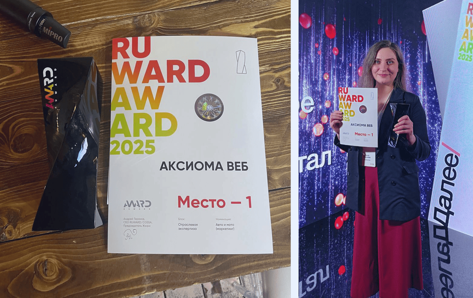 24 апреля прошла торжественная Церемония Награждения RUWARD AWARD 2025. Агентство цифрового маркетинга «Аксиома Веб» заняло 1 место среди маркетинговых агентств в отраслевой экспертизе «Авто и Мото».