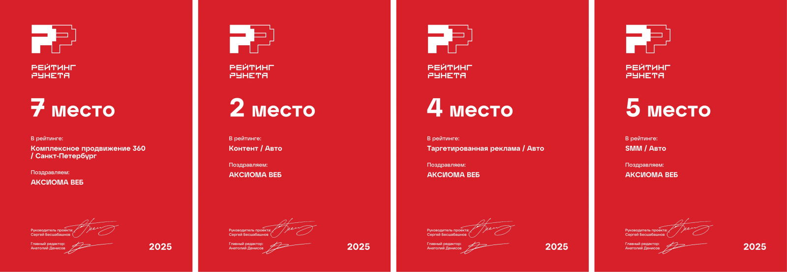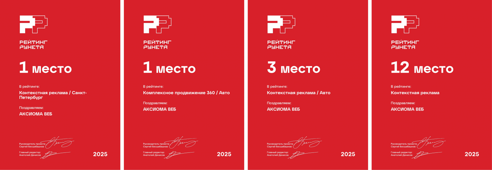 Рейтинг Рунета опубликовал очередные рейтинги диджитал-агентств. В 2025 году Аксиома Веб заняла 1 место среди агентств контекстной рекламы Санкт-Петербурга и и 1 место в рейтинге «Комплексное продвижение» в категории «Авто».