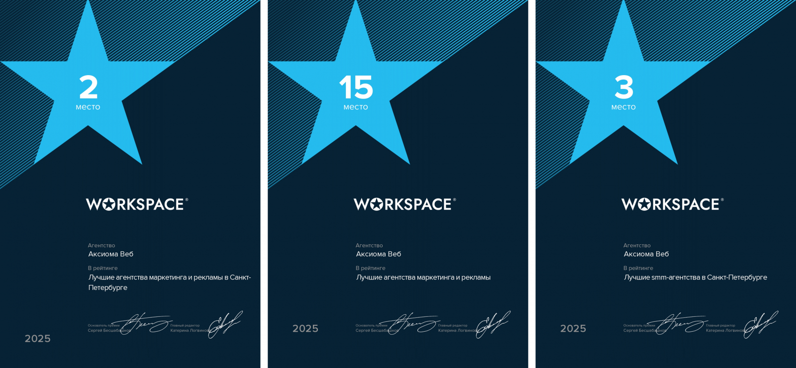 Агентство цифрового маркетинга «Аксиома Веб» вошло в ТОП-20 лучших агентств маркетинга и рекламы рейтинга Workspace 2025.