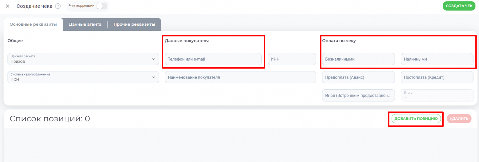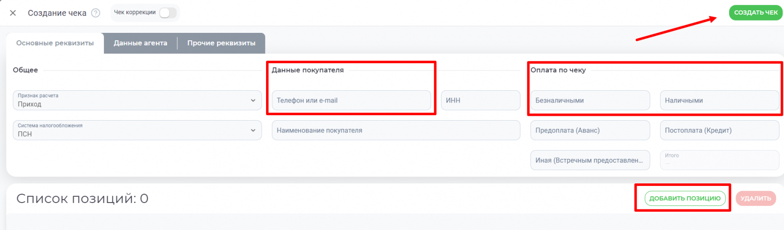 В открывшемся окне «создание чека» указывается информация об оплате и данные покупателя — адрес его электронной почты или номер телефона. Здесь же нужно добавить необходимые позиции — сведения о купленных товарах или приобретенных услугах.