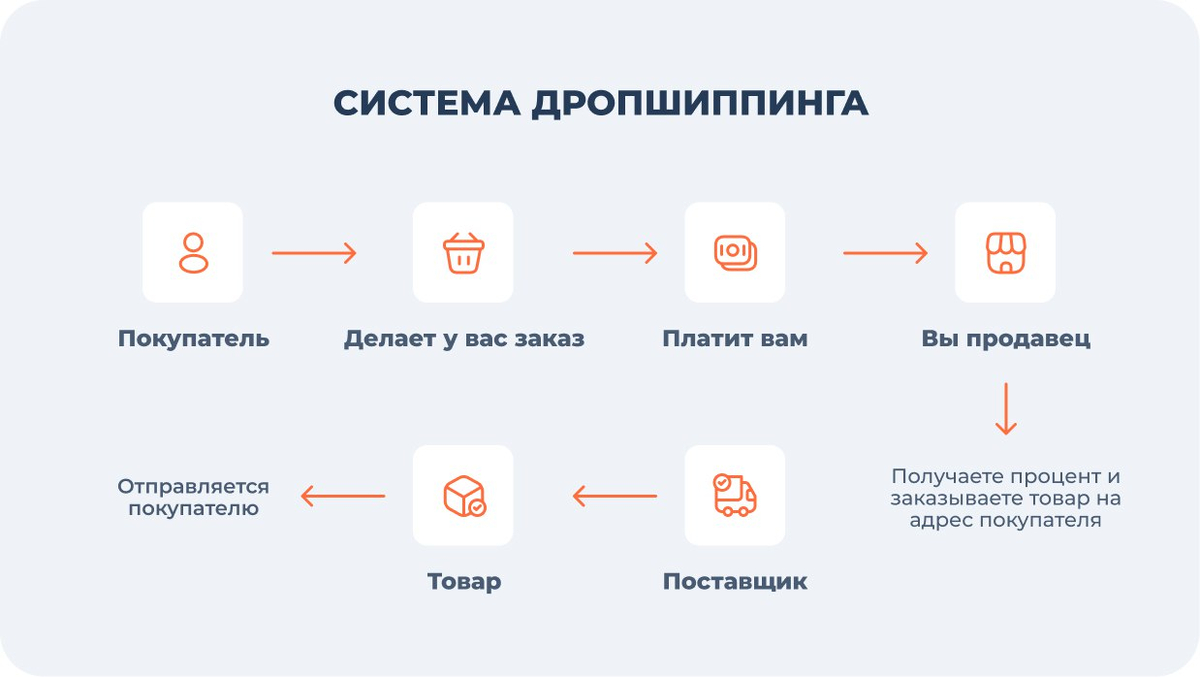 Это схема продаж, в которой продавец выступает посредником между клиентом и поставщиком. Продавец-дропшиппер находит покупателей, принимает заказ, передает его поставщику, тот в свою очередь доставляет товар клиенту и платит дропшипперу комиссию.