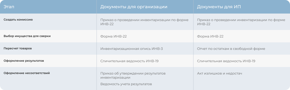 ИП нет необходимости документально оформлять этапы инвентаризации. Важно оформить итоги, особенно если фактические данные существенно отличаются от данных учета. Если расхождения несущественны, предприниматель может ограничиться распечатанными данными учета – подписать и приобщить к документам.