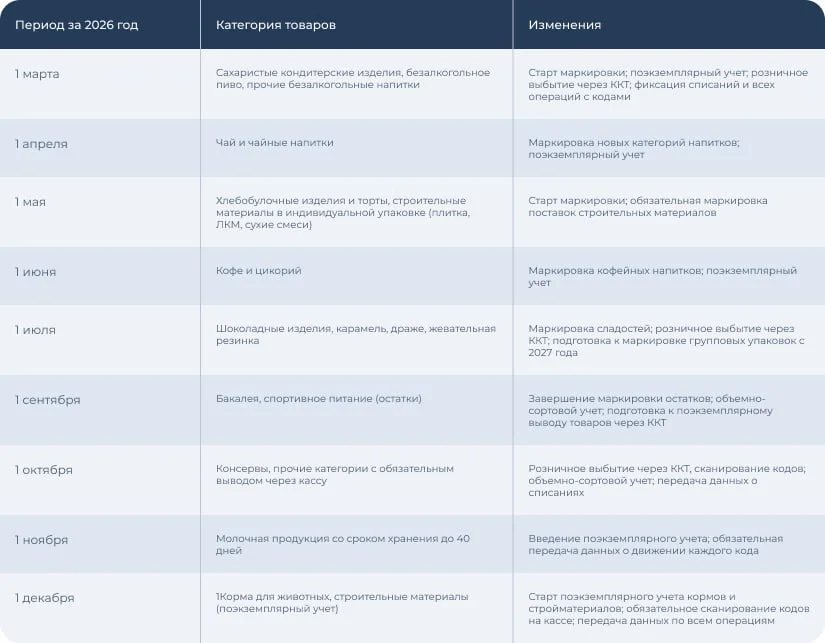 - Бакалея — с 1 сентября 2026 обязательное считывание кодов при продаже; расширяется отчетность по движению товаров.